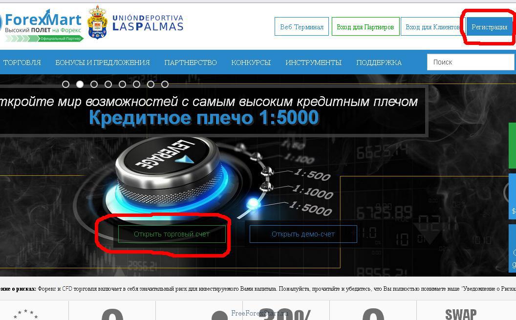 - On the main page of the official Forexmart website, click on the “Registration” button in the upper right corner or “Open a trading account” in the center of the screen: