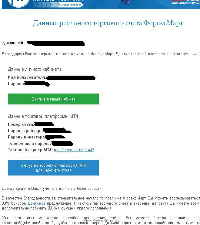 Await confirmation from the broker, check your balance, download the terminal, and you can start trading. - By the way, the Forexmart login information for accessing the client area and trading account will be sent to the email address provided during registration. Be sure to save this information. I usually take a screenshot and save it on a flash drive and the computer’s hard drive: