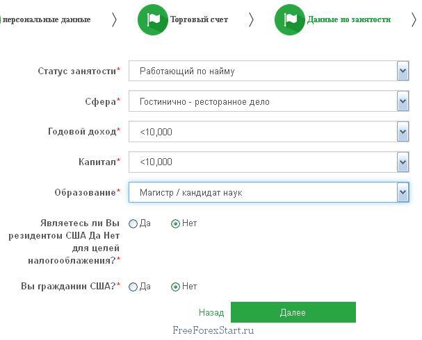 - In the next window, you will need to fill in information about your professional occupation, education, income level, and US residency. I suspect that the information from this section and the previous one is the basis for calculating the size of the Forexmart no-deposit bonus. After entering all the required information, click “Next”: