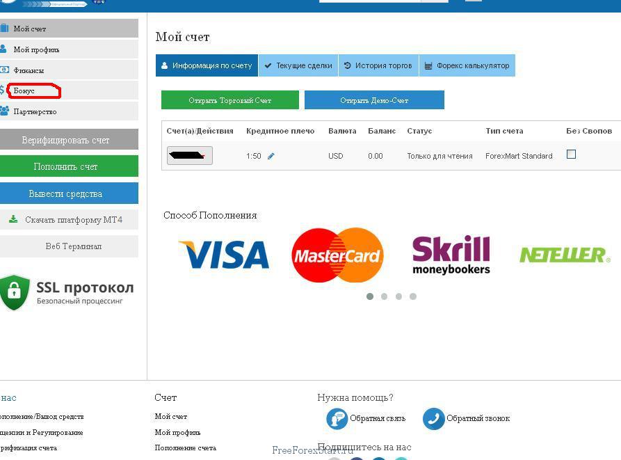- To receive bonus money into your trading account balance, click on the “Bonus” section on the left and enter the bonus section: