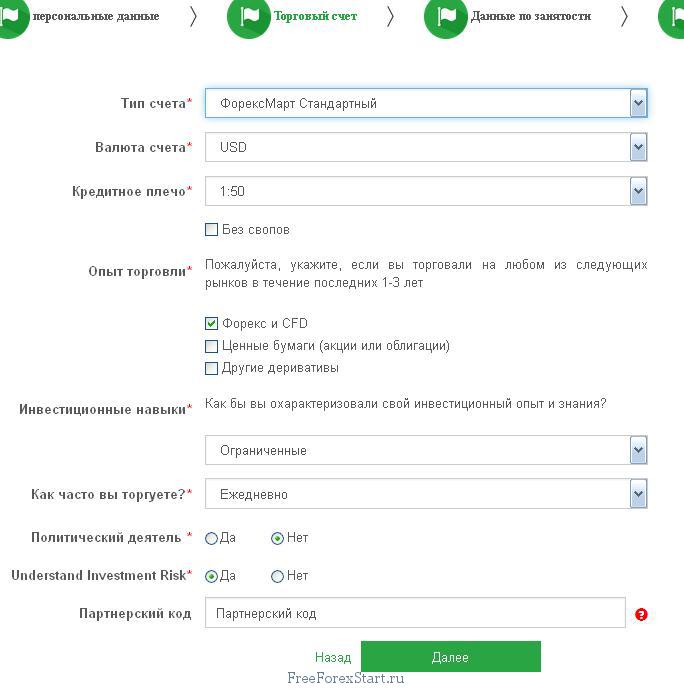 - On the new page, you will need to specify the type of Forexmart trading account you intend to open, provide information about your trading experience and the instruments you are familiar with, and also confirm that you understand the risks of trading on high-margin markets. Then click “Next”: