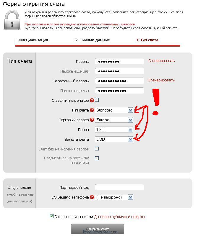 - In the new form, you need to specify information about the trading account parameters. You can come up with a password yourself, or you can simply generate it automatically by clicking on the word “Generate”. Note that the credit leverage should be 1:200, choose the Standard account type, and set the account currency to USD. Checked everything? Is everything correct? Then click on “Open Account”: