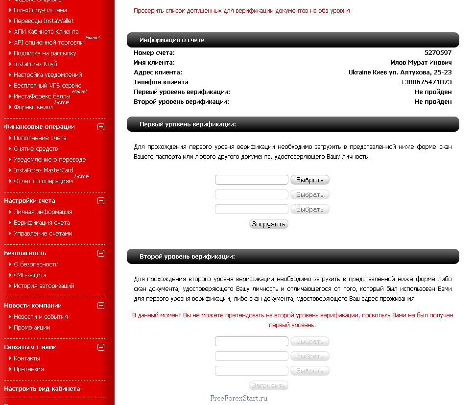 - Now we need to verify ourselves to complete the process of receiving the no deposit bonus from InstaForex. It’s quite simple: click on the red “not verified” inscription. You will be taken to the document verification section. The process consists of two levels. At the first level, you need to upload a scan of your passport or a similar document to confirm your identity. If everything is okay, within 72 hours you will receive an email confirmation of successful completion of the first level of verification. After that, to pass the second level, you will need to upload a scan of a document confirming the address of residence you provided when opening the trading account: