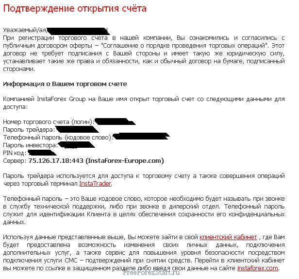 Plus, an SMS from InstaForex is also sent to the mobile number provided during registration. This SMS also contains information about the trading account. - Now you can enter the client area (trader’s Area). Click on the “trader’s area” button at the top of the page or look in the text displayed after registration for a link to go to the Client Area: