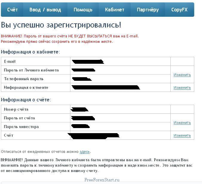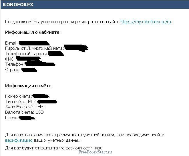 After successful confirmation, a page will open with login details for your account at RoboForex and access to the trading account. This information will also be sent to your email:
