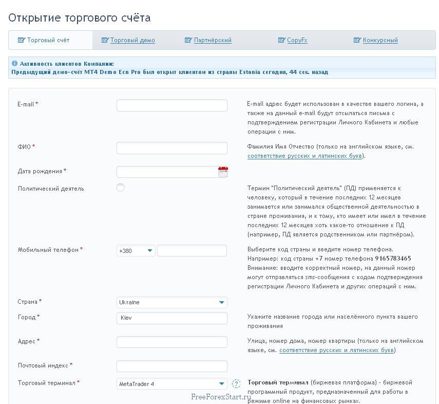 Fill in all the required fields. Fill in everything in Latin.Please note that the RoboForex bonus is not available for ECN accounts, so choose the account type immediately: MT4 Fix-Cent, MT4 Pro-Cent, MT4 Fix-Standard, MT4 Pro-Standard, MT5 Fix-Cent, MT5 Pro-Cent, MT5 Fix-Standard, MT5 Pro-Standard. The account currency should be USD (US dollars). The leverage is 1:100.
