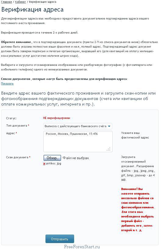Now click to verify your address. On the opened page of your account, you will also need to select the type of document you will use for address verification and provide your address. By the way, note that a fairly large list of various documents is accepted, so you should not have any difficulties with this: