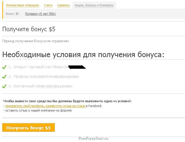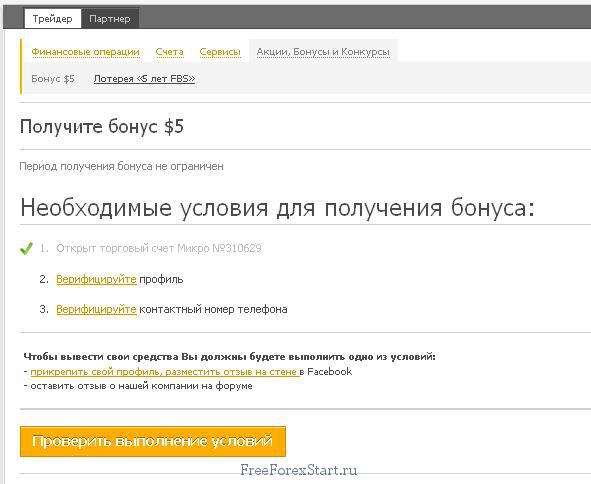 On the aforementioned page, you will see a checkmark if your data is successfully verified. When checks are placed next to all the conditions, then you will be able to receive a FBS bonus of 5 dollars: