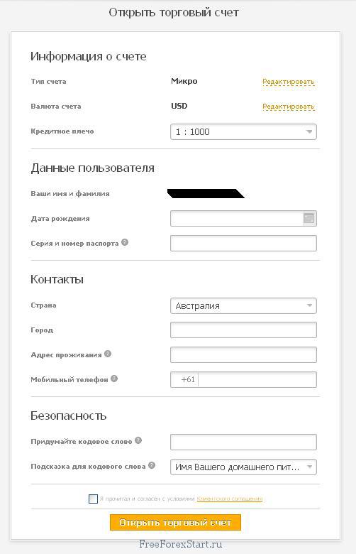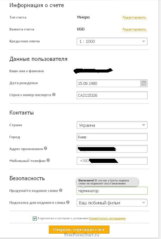 We fill in the form, pay attention to the correctness of the data and correspondence to the passport data, which will then need to be sent for verification. Note that you need to remember your secret word, also do not forget to check the box agreeing to all the rules and conditions at the very bottom: